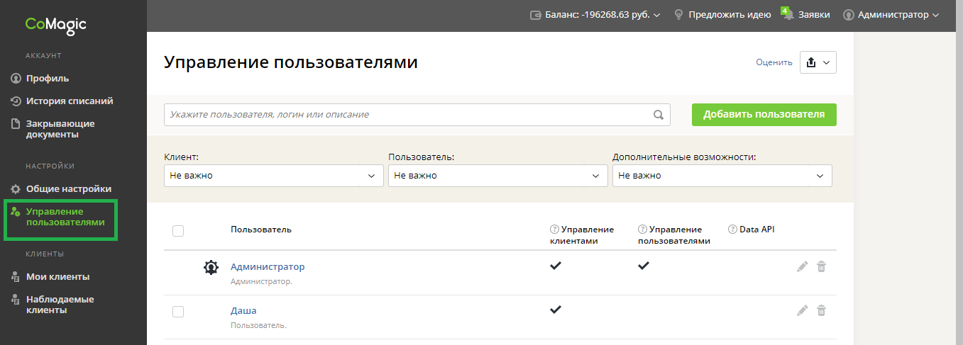 Если вы работаете по партнерской программе CoMagic, то у ваших клиентов может быть отдельный личный кабинет. Тогда настройка прав доступа будет происходит в зависимости от принадлежности кабинета клиенту или партнеру.