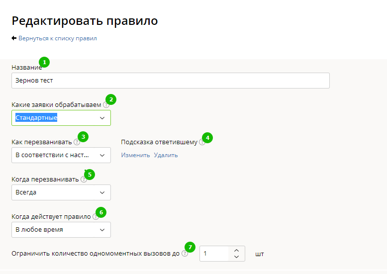 Когда правило выключено, звонки на автоперезвон, сформированные до выключения, будут обработаны по правилу, а новые заявки обрабатываться не будут.