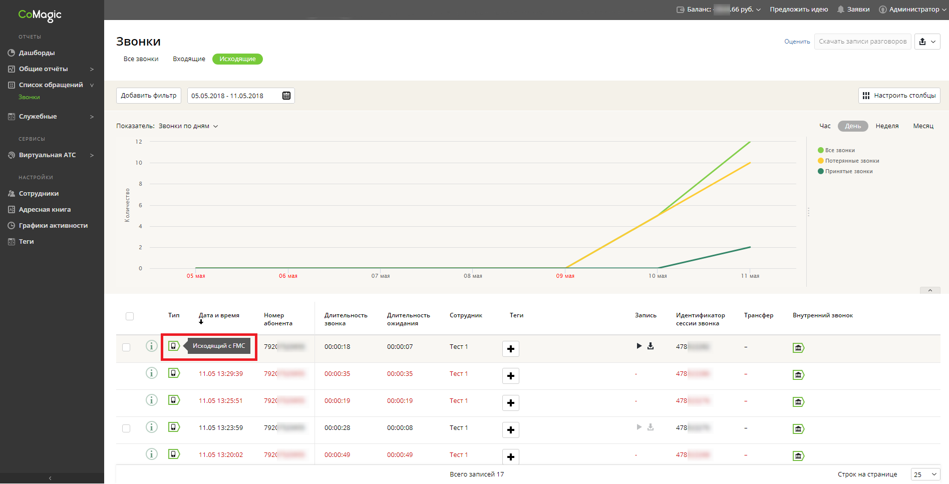 Исходящие звонки, совершенные с FMC линии, попадают в отчет Звонки - направление звонка - Исходящий. Тип сессии "Исходящий с FMC".